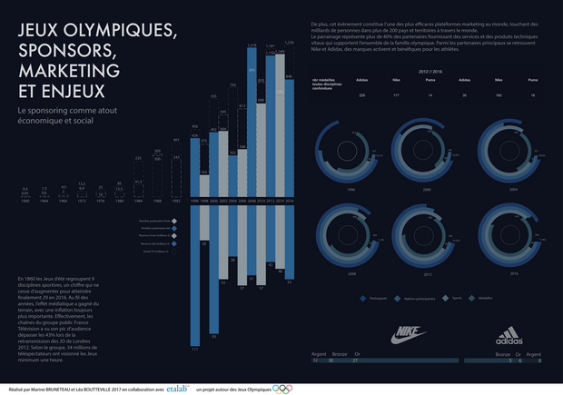 Les étudiant·e·s du Master 1 « Design, Médias et Technologies » de l’Université Paris 1 Panthéon-Sorbonne ont travaillé sur l’illustration des Jeux Olympiques à travers le prisme de leurs retombées et de leurs impacts. Leur travail a été réalisé en partenariat avec Etalab et le Ministère de la ville, de la jeunesse et des sports.